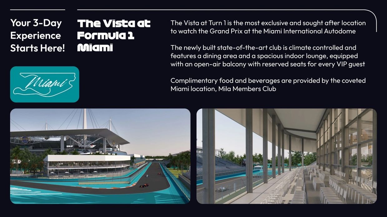 The Vista at Turn 1 is the most exclusive and sought after location to watch the Grand Prix at the Miami International Autodome